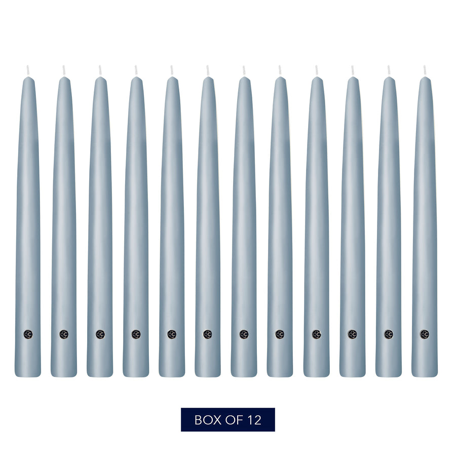 Our rich blue unscented eight-inch Wedgewood taper candles are hand dipped, with a burn time of up to eight hours each.