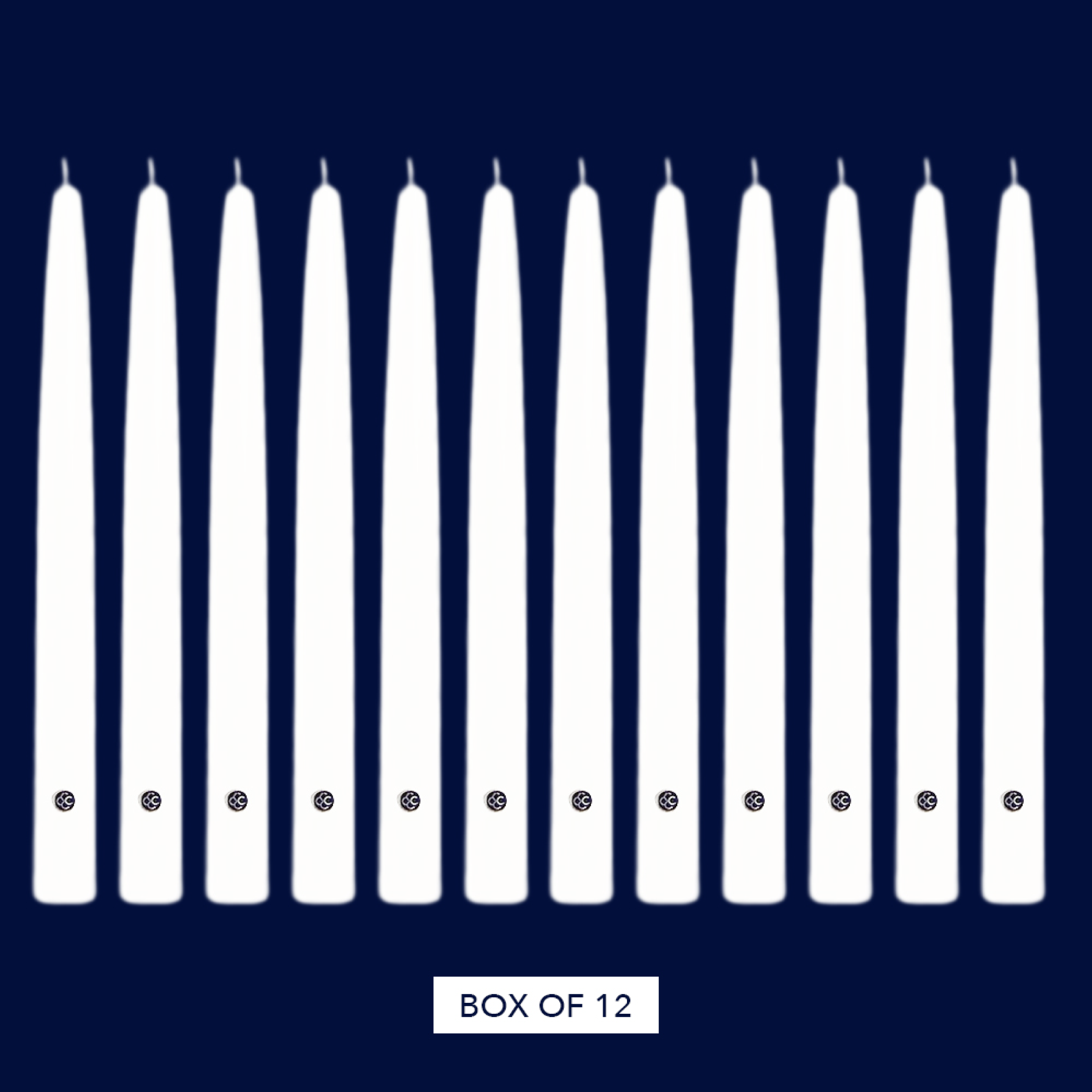 Our richly-colored and elegant unscented eight-inch White taper candles are hand dipped, with a burn time of up to eight hours each.