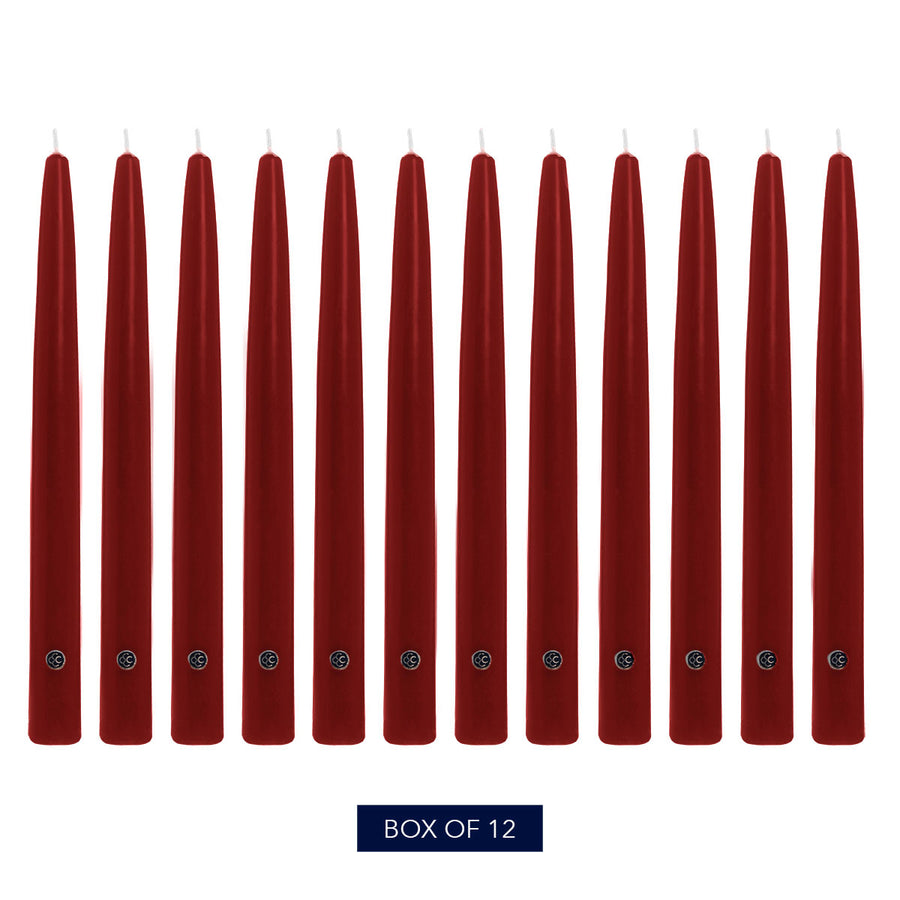 Deep red and elegant, our Traditional Cranberry taper candles bring a glow to your home décor. These our Traditional Cranberry taper candles bring a glow to your home décor. These twelve-inch candles are hand dipped, virtually drip free, and have a burn time of up to ten hours each, perfect for entertaining.