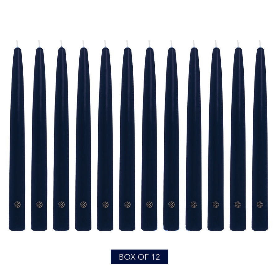 Our refined unscented twelve-inch Indigo taper candles are hand dipped, with a burn time of up to ten hours each.