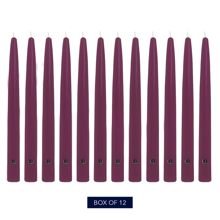 Our rich purple-red twelve-inch Mulberry taper candles are hand dipped, with a virtually drip-free burn time of up to ten hours each.