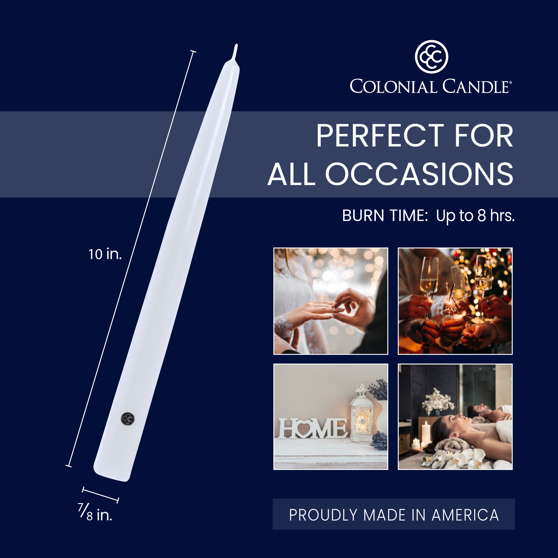 With elegant simplicity, our unscented White taper candles bring a soothing touch to your home décor. These ten-inch candles are hand dipped, virtually drip free, and have a burn time of up to eight hours each.