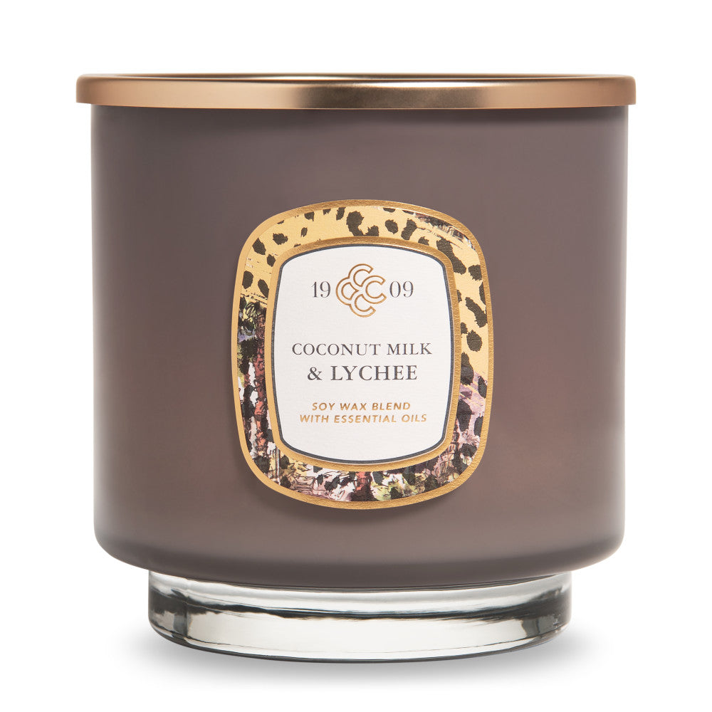 This soothing coconut milk aroma is bursting with zesty hits of sweet lychee. This decadent fragrance is captured in a smoky gray jar with an elegant gold lid. The beautiful vessel is enclosed in a decorative box embossed with the timeless Colonial Candle four Cs and the 1909 logo in delicate gold leaf. Evoking the light of luxury, 1909 celebrates the artistry of fine fragrance.